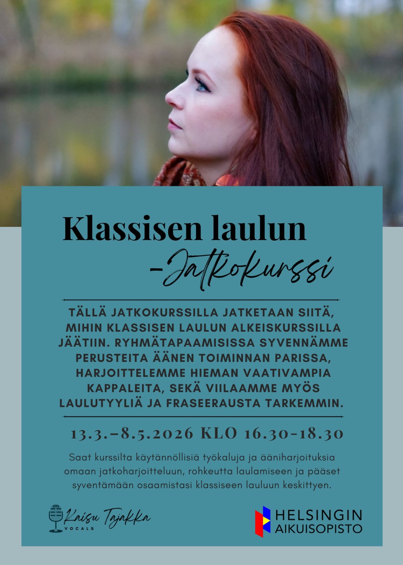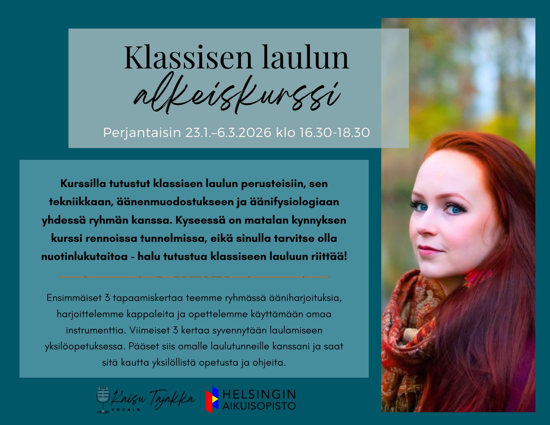 Saat kurssilta konkreettisia ja käytännöllisiä työkaluja omaan harjoitteluun, perusteet klassiseen lauluun kannustavassa ilmapiirissä ja rohkeutta laulamiseen.
